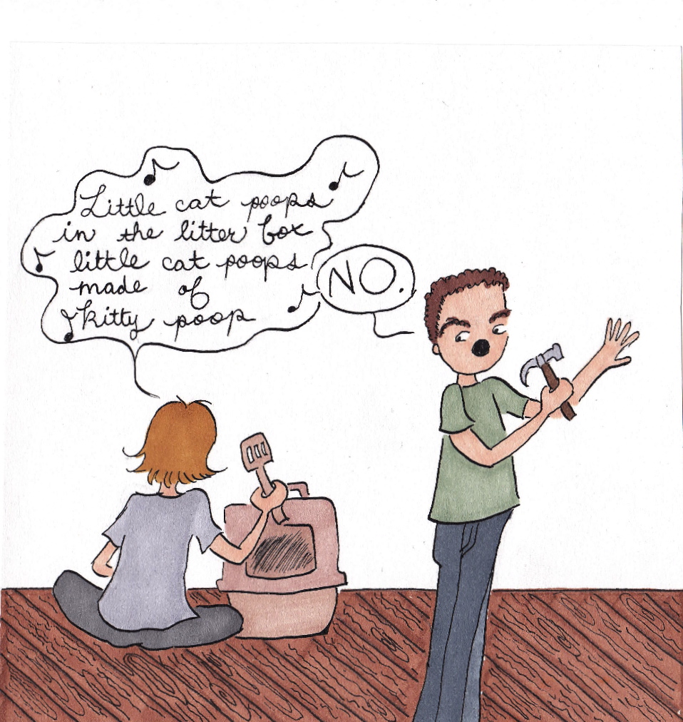 (We are on the train.) The invention is a tube with a gentle hand at the end of it, which gently lays itself against your loud face and there's a little speaker attached to the tube and in my Mom's voice it says, "Shh! Indoor voices please!" Which is something my mom says.